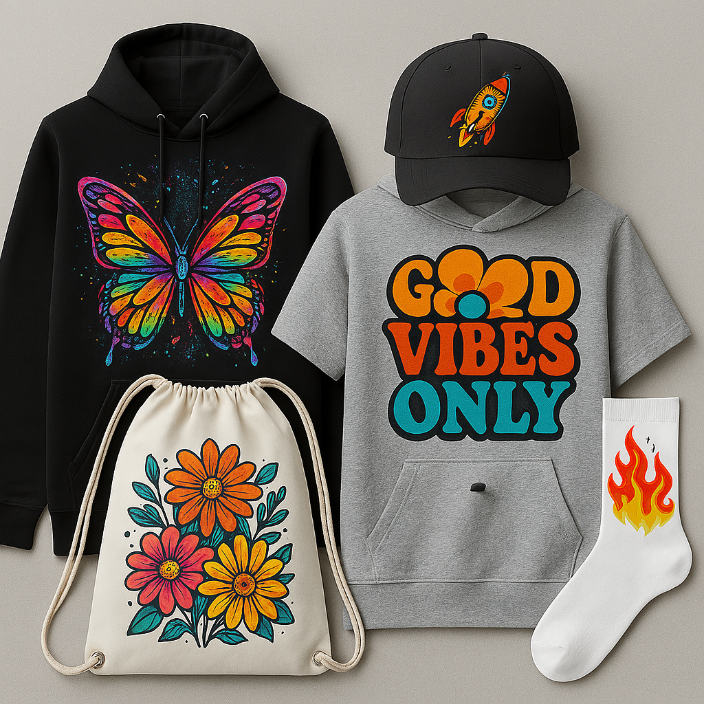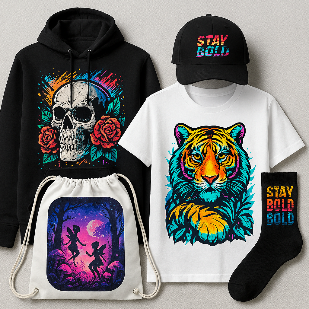 - Potisk textilu: Nabízíme potisk triček, mikin, tašek a dalších textilních výrobků dle vašich přání.